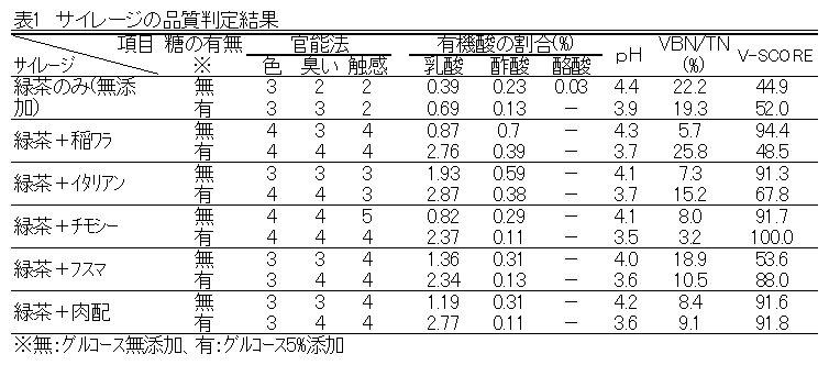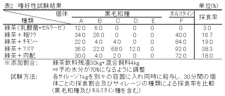 緑茶飲料残渣サイレージを調製する場合、市販乳酸菌製剤を添加しなくても、粗飼料や濃厚飼料と混合することにより、嗜好性が増し、簡易な良質サイレージの調製が可能となる。 |