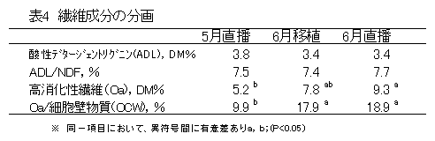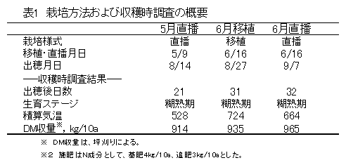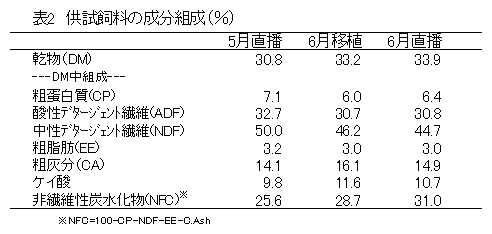 飼料イネの生産場面において、所得向上の観点から他の作物との輪作が想定される。その場合、飼料イネの播種および移植作業は4~6月が考えられるが栽培時期の違う飼料イネの飼料特性を比較した情報はない。 |