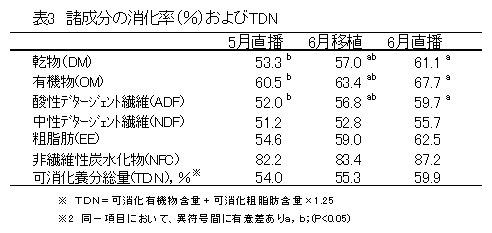 6月中旬に直播して糊熟期に収穫調製した稲発酵粗飼料の乾物、有機物、酸性デタージェント繊維の消化性は、5月上旬のそれに比べて優れる。また、可消化養分総量は6月中旬のものが5月上旬のものに比べて優れる傾向にある。 |