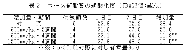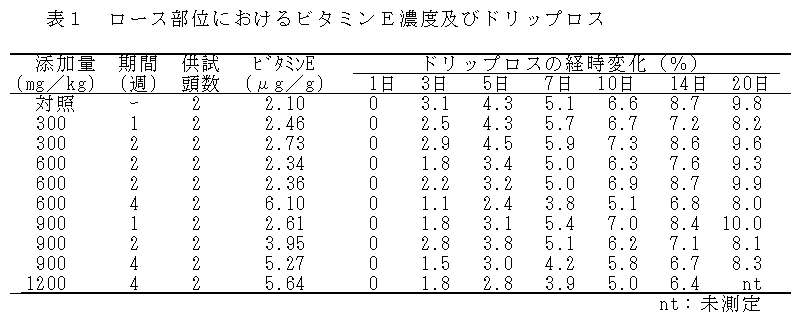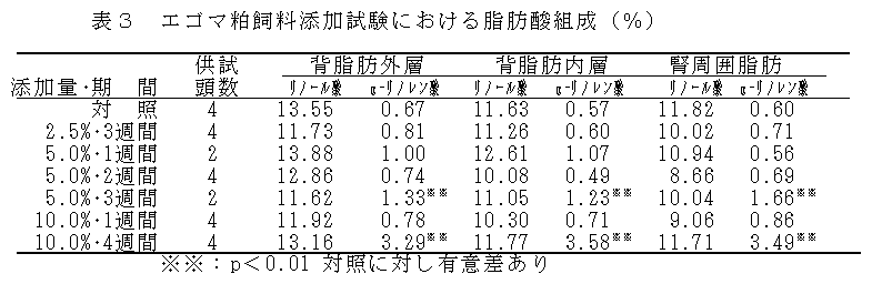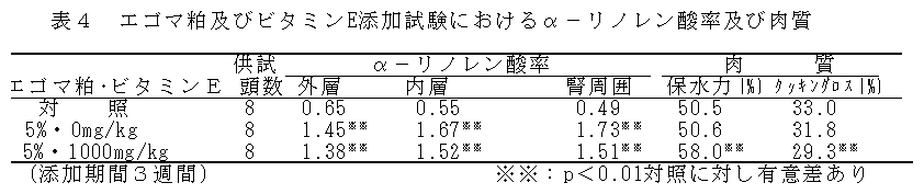飼料中にエゴマ粕とビタミンEを同時添加することにより、α-リノレン酸の含有率が高く、保存性に優れた高付加価値豚肉が生産できる。 |