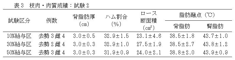 学校給食残渣由来発酵乾燥物を養豚用飼料として利用する場合、肥育前期に30%混合飼料、肥育後期に10%混合飼料として給与することが可能である。 |