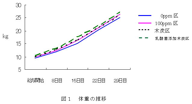 供試豚は、同一離乳日の母豚2頭から得られたデュロック種産子16頭を用い、各試験区に去勢1頭、雄1頭、雌2頭を割り当て1区4頭とした。試験方法は、「0ppm区」(銅無添加飼料)、「100ppm区」(銅100ppm添加飼料)、「木炭区」(木炭を銅無添加飼料に1%添加)、「乳酸菌添加木炭区」(2㎜メッシュ粉炭1㎏にEnterococcus faecium、Lactobacillus plantarumu、Lactobacillus acidophilusの3種を含む液状の乳酸菌(2.4×108cfu/ml)0.67lを混合し、フリーズドライ処理したものを銅無添加飼料に1%添加)の4区を設定した。試験は生後30~60日齢の16頭の子豚を用い、各区4頭ずつ割り振り、発育、ふん中への銅排出量及びふんの性状について調査した。 |
