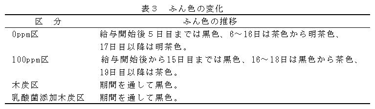 銅低減飼料を離乳豚に給与すると軟便が散発するが、フリーズドライ処理した乳酸菌添加木炭を添加するとこれを抑制し発育が改善される。 |