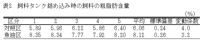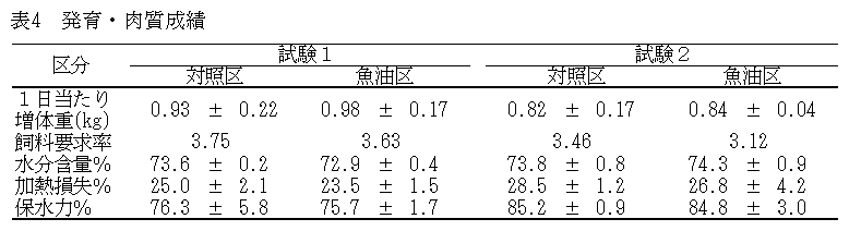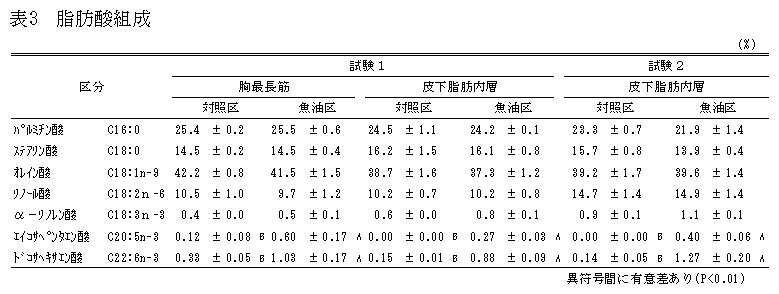 肥育後期飼料に魚油を添加給与することにより、背脂肪内層の脂肪酸組成はEPA、DHAの割合が増加する。また、魚油を飼料に配合する方法として、飼料タンク詰め込み時に添加することにより均一に配合できる。 |