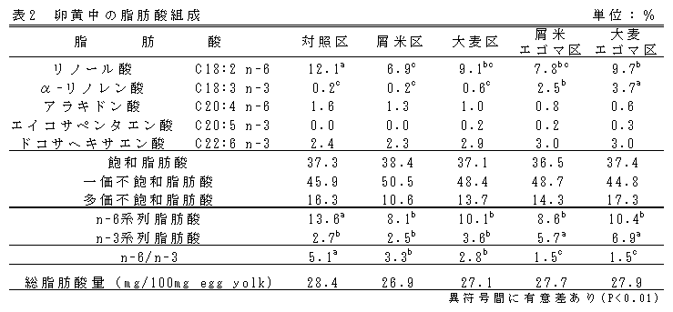屑米、屑大麦主体の飼料を採卵鶏に給与することにより、卵黄中のn-6系列脂肪酸であるリノール酸の割合が減少し、さらにエゴマ種子の添加によりn-3系列の脂肪酸であるα-リノレン酸の割合が10倍以上に増加し、n-6/n-3比は2以下に低下する。 |