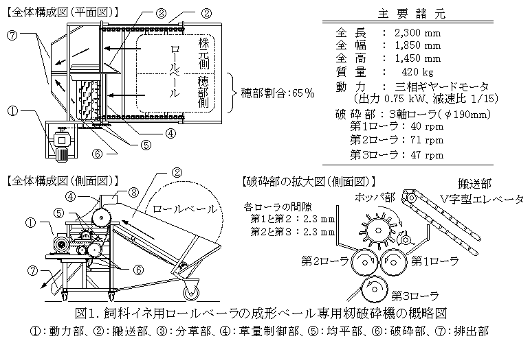 開発した籾破砕装置はV字型エレベータによってベールを回転させながら解体・搬送し、分草板によって穂部が集中しているベール片側50cmの部位をホッパ内へ投入し、均平機を用いて一定量の材料草を3軸ローラへ送り込んで破砕処理する構造である(図1)。 |