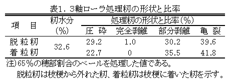 飼料イネ用ロールベーラによって成形されるベールは片側に穂部が偏る傾向がある。その特徴を利用した専用籾破砕装置は、穂部が集中しているベールの片側50cmの部位を3軸ローラで処理する構造であり、70%以上の籾に破砕処理を加えることができる。 |