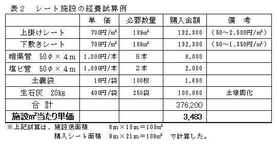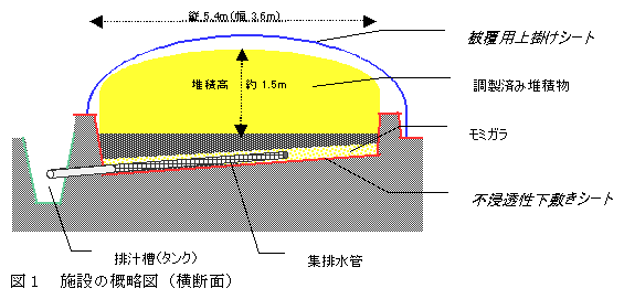 市販の不浸透性シートを利用した堆積施設(以下「シート施設」)は、発酵中途の堆肥や製品堆肥を貯蔵保管しておくストックヤードとして、補完的に利用するのに有効である。また、切り返し作業を行う、あるいは通気管を埋設することで、堆肥化を促進することが可能となり、堆肥化施設としても用いることができる。 |