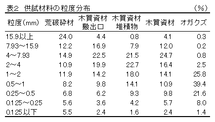 林地等から発生する梢、枝葉、抜根材や製材端材等の未利用木質資源を荒破砕後、植繊機で破砕した木質資材は、オガクズに比べると水分の吸収性が悪いが、オガクズ等と混合すると豚舎敷料として利用可能である。 |