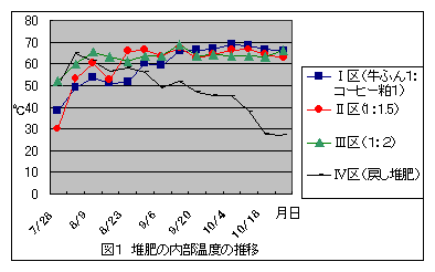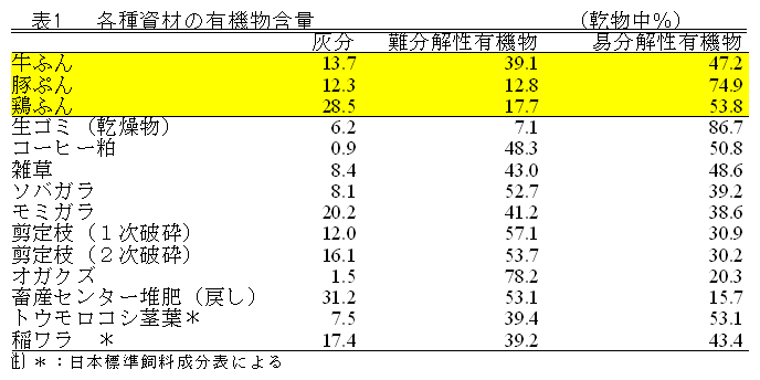 コーヒー粕、乾燥生ゴミ、剪定枝、雑草はそれぞれの特性を考慮して、家畜ふんの堆肥化副資材として利用すると堆肥化は良好に進む。 |