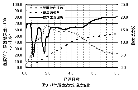 密閉された発酵槽の下部から通気し、発酵槽上部から排気する発酵槽、及び排気中の酸素濃度をもとにした間欠制御系から構成される密閉堆積型発酵装置を用いることで、悪臭の拡散を防止し通気の効率化を図った堆肥化ができる。 |