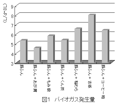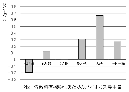 8リットルの発酵汚泥(55℃,高温菌)に豚ふん(固形物含量25.9%、有機物含量22.8%)を有機物量で8g相当を投入し、投入した有機物が全量の5%となるように水を投入した。さらに、敷料・副資材6種類を有機物量で4g相当を追加投入した。HRT(水理学的滞留時間)は50日。60日間の連続投与を行った。ガス発生量は安定後の30日分の平均値を示した。また汚泥性状は60日後に採取した汚泥の分析値を示した。古紙はシュレッダー処理済みのコピー用紙を、コーヒー粕はコーヒー製造工場から排出されるコーヒー豆精製後の皮を、その他の資材は一般的なものを用いた。 |