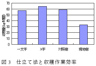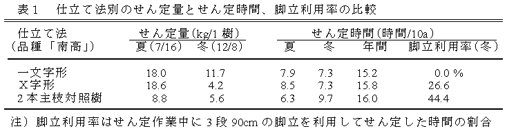 樹高を3m程度に抑えたウメ「南高」の一文字、X字低樹高仕立て法は主産地の平均収量1,600kg/10aを樹齢6年で超えることができ早期多収であり、収穫作業能率も慣行仕立て樹より高く、せん定にも一部脚立を利用する程度で安全な管理作業が可能である。 |