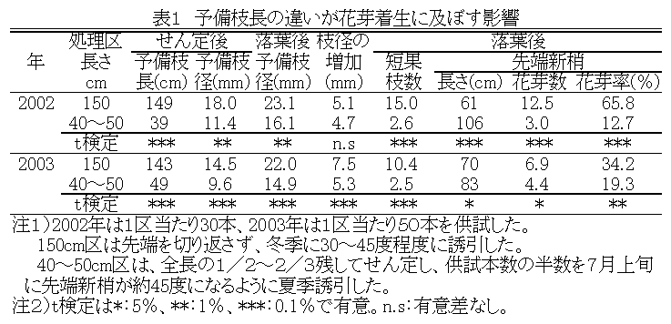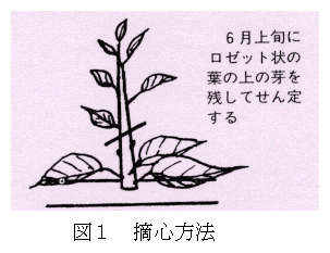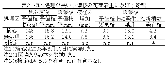 花芽の着生が少ないニホンナシ「あきづき」では、長さ 150cm程度の1年枝の先端を切り返さずに予備枝として利用し、先端部以外の新梢を摘心処理することにより、発育枝数を減少させ、短果枝及び先端新梢にえき花芽を着生させる。 |
