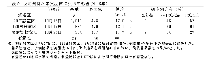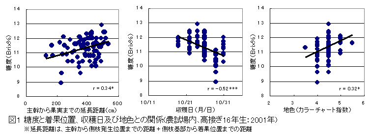 ニホンナシ「にっこり」は収穫時期が早く、主幹から遠い位置に着果した果実、地色が進んだ果実、大きい果実ほど糖度が高い。そのため、主幹から遠い位置から発生した側枝を利用し、摘果時期を早めることにより大玉で高糖度な果実の生産が図れる。更に、反射資材を利用することで果実糖度はより高まる。 |