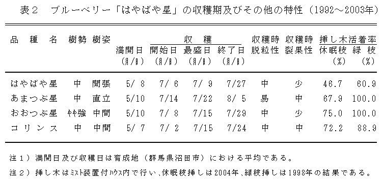 「はやばや星」は「コリンス」または「コビル」の自然交雑実生から選抜育成されたハイブッシュブルーベリーで、育成地において7月上旬に収穫最盛期になる早生品種である。果実は大きく、酸味がやや強く、食味は濃厚である。 |