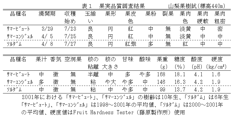 「サマービュート」は「ソルダム」に「ブラックビュ-ト」を交雑し、「サマーエンジェル」は、「ソルダム」に「ケルシー」を交雑して育成したスモモ品種である。両品種とも、7月下旬に成熟し、大玉で、糖度が高く食味は良好である。 |