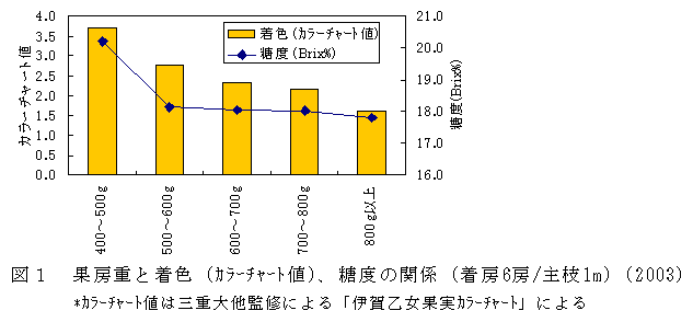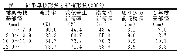 ブドウ「安芸クイーン」は短梢せん定の適応性が高く、基部径8~10mmの結果母枝が安定生産に適している。大房、着果過多による着色不良、糖度低下を考慮して1果房重は500g程度、着房数は主枝1m当たり6房までとする。 |