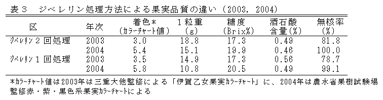 有望な赤色系品種「安芸クイーン」は花振い性が強いため着粒が不安定であり、また適切な着果管理を行わないと着色不良になりやすいという特性を持つ。したがってジベレリン処理による無核栽培と平行整枝による短梢せん定を組み合わせることにより、誰もが安定的に、かつ簡易に生産できる方法を確立する。 |