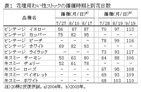 [キーワード]ストック、到花日数、品種、花壇苗 |