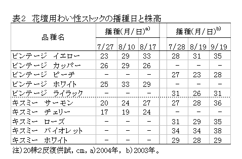 花壇用わい性ストック品種の播種日と作型 |