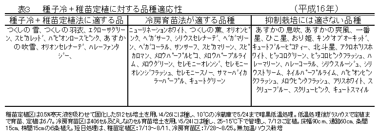 トルコギキョウの抑制栽培では、適品種を選定し、10℃で4~5週間の吸水種子低温処理後育苗日数2週間の稚苗を定植すると、切り花品質が向上する。 |