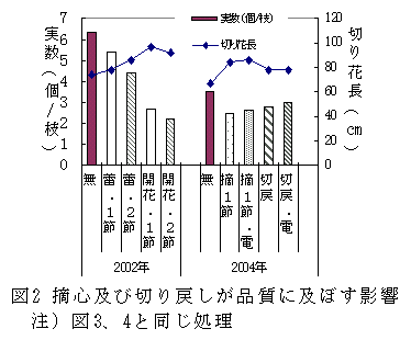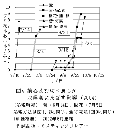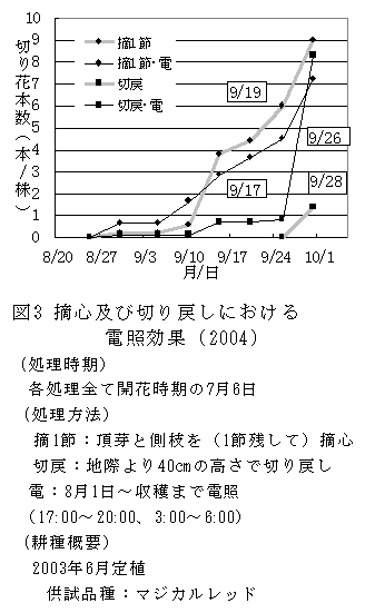 ヒペリカム露地栽培では、蕾期から開花期の間に摘心を行う方法、および蕾期から開花期の間に切り戻しを行い電照する方法で収穫期が拡大できる。 |