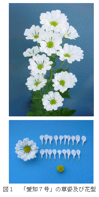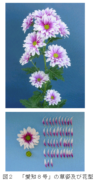 秋系スプレーギクの新品種「愛知7号」、「愛知8号」を育成した。「愛知7号」は白色、さじ状の立弁を有し、茎及び花首の伸長性が高い。「愛知8号」は白-赤紫色の覆輪で、半八重咲きである。 |