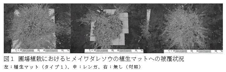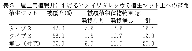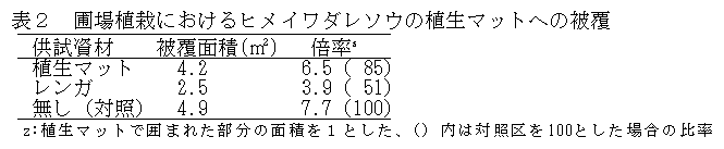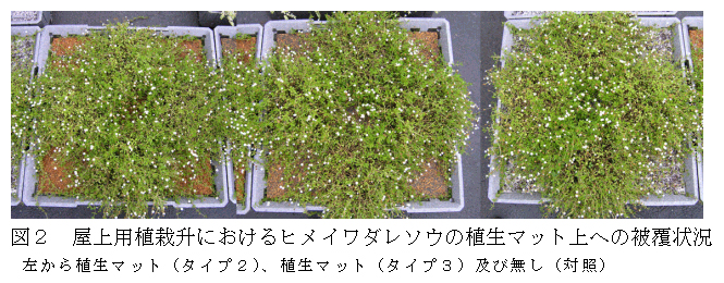建設発生木材を加工した「植生マット」についてヒメイワダレソウを用い被覆資材としての利用の可能性を検討したところ、植生マット上の接地部分から発根し、良好な被覆面を形成するため、屋上緑化に活用できる。 |