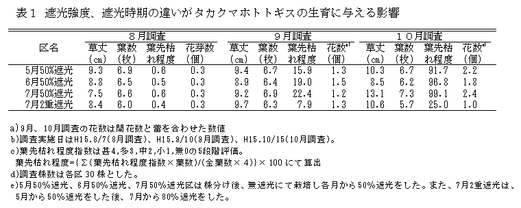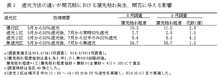 タカクマホトトギスの葉先枯れ発生を抑えるとともに、花数の減少を防ぐためには、7月以降、晴天時の11時から14時の時間帯を約80%遮光下で管理する。 |