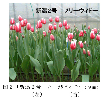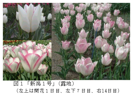 チューリップ「新潟1号」は、花色が白色から淡赤紫色に変化する花壇用の色変わり品種である。「新潟2号」は「メリーウィドー」の芽条変異選抜系で、促成切り花栽培において開花が早く、草丈が伸びる。 |