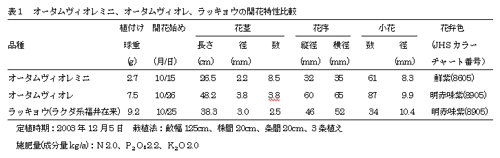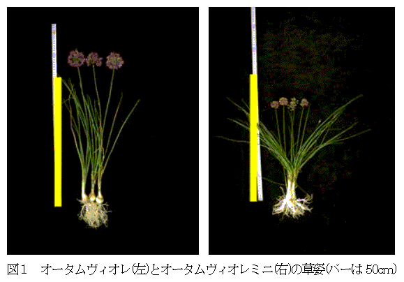 ラッキョウとキイイトラッキョウとを交配し、子房培養により「オータムヴィオレミニ」を育成した。「オータムヴィオレ」より花茎が短く花序も小さく小型で、花茎数が多いので、鉢物、花壇植えに適する。 |