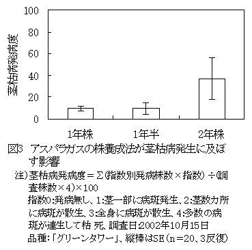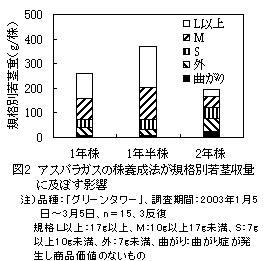 促成アスパラガス栽培の1年半株養成法は、1年株および2年株養成法に比べ、省力的な株養成法であり、茎枯病の発生が少なく、促成栽培における収量で1年株養成法および2年株養成法に優る。 |