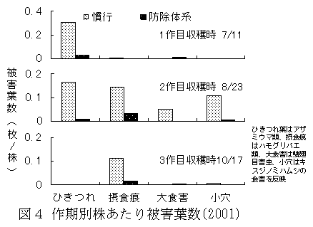 施設栽培コマツナにおいて、UVカットフィルム、防虫ネットおよび太陽熱処理を用いた物理的防除体系によって虫害を大幅に軽減できる。品種により軟弱徒長となる傾向があるが、品種選定により品質の確保は可能である。 |