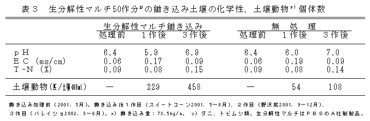 生分解性マルチは展張作業性、耐久性で実用レベルを有し、収量性や収穫期はポリエチレンマルチと同等である。鋤き込んだマルチが後作水稲の移植に支障をきたすことはなく、一度に大量に鋤き込んでも、土壌の化学性などに大きな変化を及ぼすことはない。 |