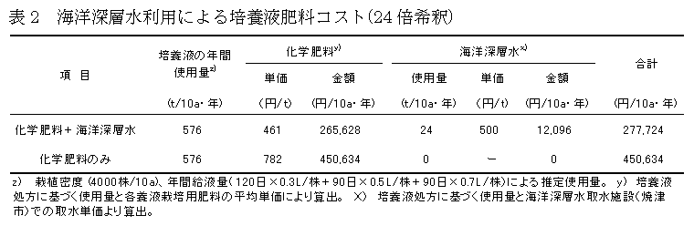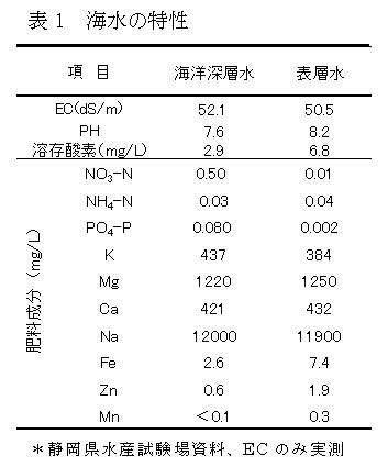 水分ストレスを付与するために高濃度培養液を用いる高糖度トマトの養液栽培では、年間の肥料使用量が多く、コスト削減が求められている。そこで、水分ストレスを付与するための肥料成分として駿河湾海洋深層水等の海水を用いた高糖度トマト栽培法を確立し、肥料コストの削減を図る。 |