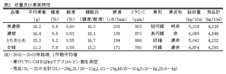 「女峰」と「宝交早生」の交配系統に「とよのか」と「濃姫」の交配系統を交配して得られたイチゴ新品種「美濃娘」は食味、硬度、外観等の果実品質が優れ、連続出蕾性が優れるため多収である。 |