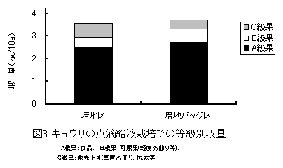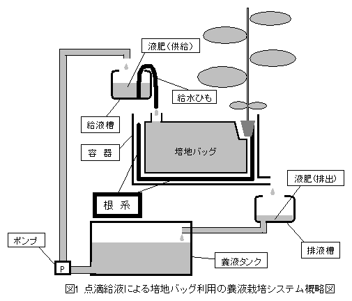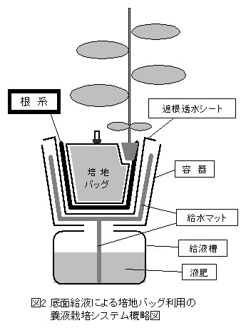培地バッグは固形培地を遮根透水シートで包んだもので、その外側に苗を植え付ける。養水分の保持および作物への供給等の機能は、養液栽培における固形培地と同等で、くり返し利用できるので、栽培終了後の棄却培地の量を少なくすることが可能になる。 |