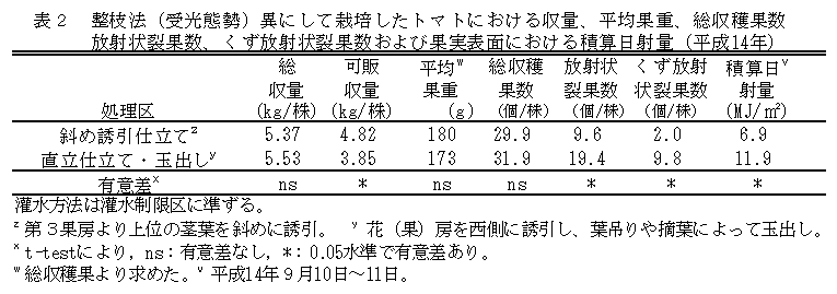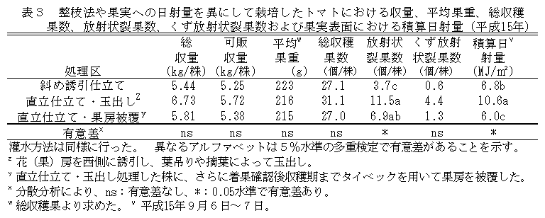 夏秋トマト雨よけ栽培における放射状裂果の発生は、灌水方法や灌水量の違いによる土壌水分の影響よりも、茎葉や果実への強い日射による影響が大きい。 |