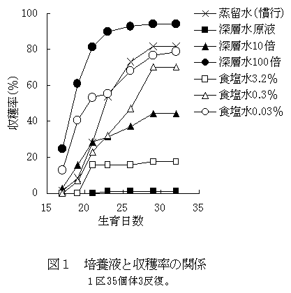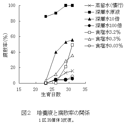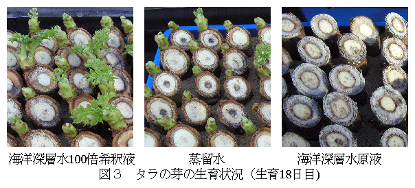 タラの芽促成栽培の培養液として海洋深層水の100倍希釈液を用いると、生育日数が短縮され、収量が増加する。 |
