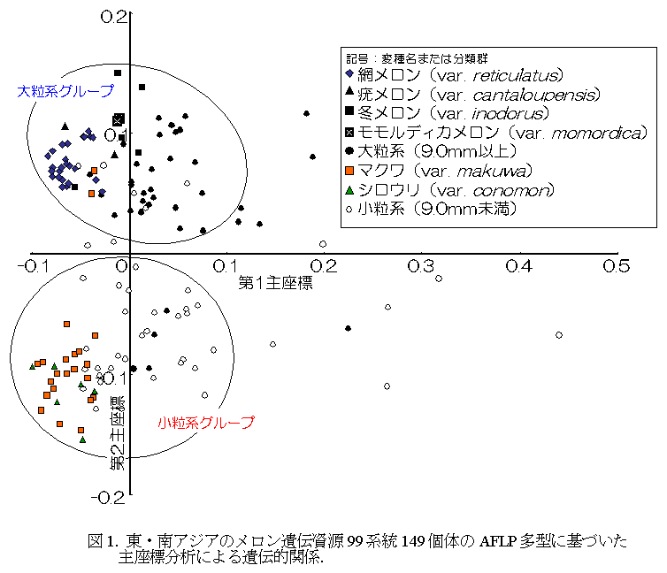 AFLP法によると日本の網メロンとマクワ・シロウリ類は、どちらも遺伝的変異の小さい集団である。マクワとシロウリ類は一つのグループに分類され、また、南アジアの小粒系と密接に関係する。一方、インドのメロンは極めて遺伝的変異に富み、育種素材として有望である。 |
