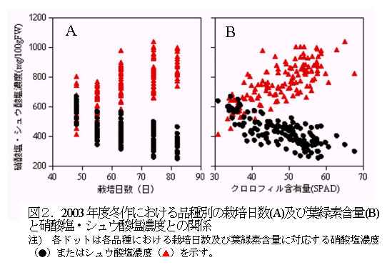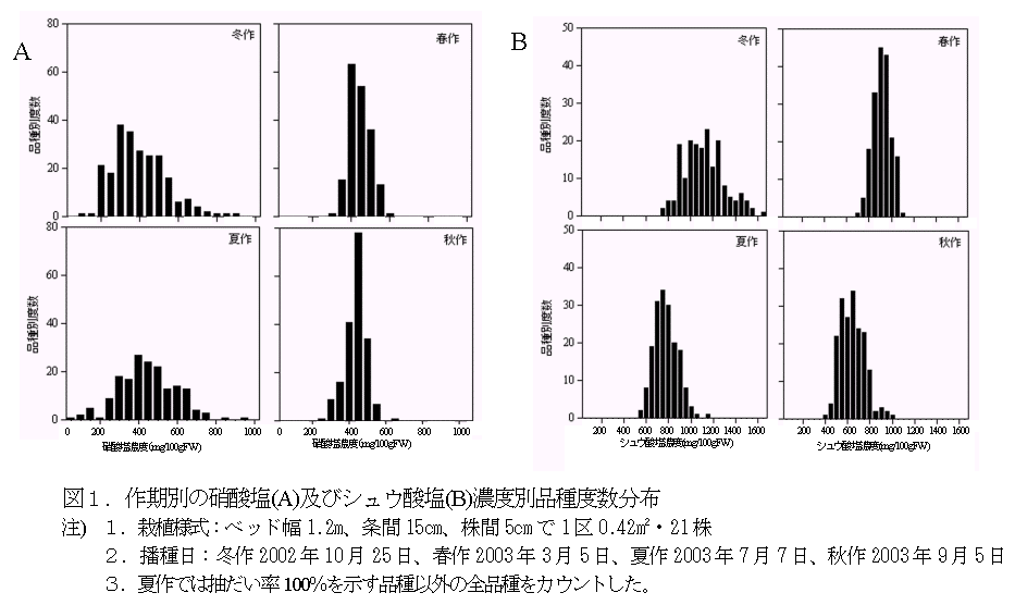 ホウレンソウに含まれる硝酸塩濃度の品種間差異は、春・秋作で小さく冬・夏作で大きい。一方、シュウ酸塩濃度の品種間差異は冬作で大きい。また、晩生で葉色が濃い品種ほど硝酸塩濃度はより低く、シュウ酸塩濃度はより高い傾向を示す。 |