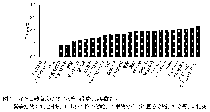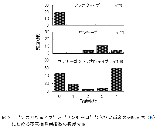 イチゴ萎黄病に対する抵抗性主働遺伝子が存在する。‘アイストロ’、‘アスカウェイブ’および‘芳玉’は質的抵抗性を有しているとみられ、‘アスカウェイブ’と‘サンチーゴ’のF1実生の分離から抵抗性主働遺伝子の存在が確認できる。 |