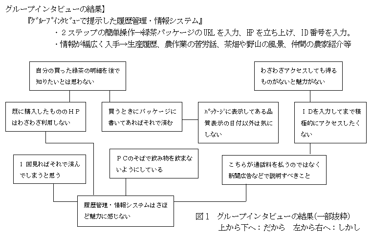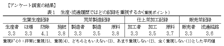 安心・安全に対する消費者の関心の高まりを受け、茶においても生産・流通履歴を追跡し情報公開するトレーサビリティの取り組みが求められている。また、茶の業界は、従来から消費者への情報発信が不足しているといわれている。そこで、消費者の満足度が高い履歴管理・情報システムを確立するために、消費者が求める情報を抽出する。 |