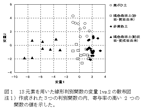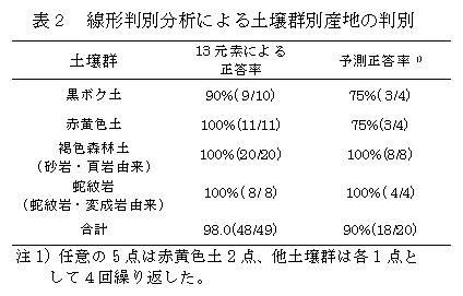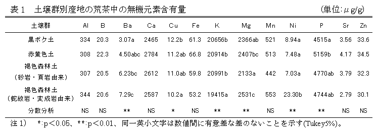 静岡県内の黒ボク土、赤黄色土および褐色森林土の産地で生産される荒茶は、Al、B、Ba、Ca、Cu、Fe、K、Mg、Mn、Ni、P、Sr、Znの13元素の含有量を用いて線形判別分析を行うことにより、土壌群別に判別できる。 |