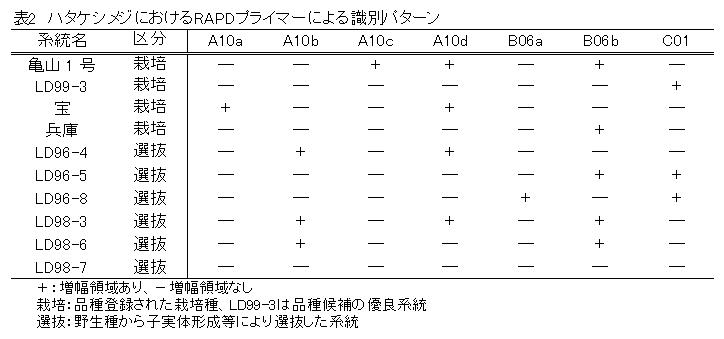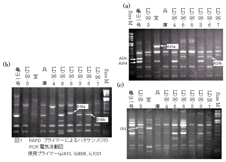 三重県内で栽培されている主要品種「亀山1号」を含むハタケシメジ10系統について、3種類のRAPDプライマーを用いたPCRによって互いに分類するDNA系統識別法を開発した。 |