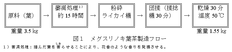製茶機械を利用して製造したメグスリノキ葉茶は乾燥処理後、フライパン等による短時間の2次乾燥処理をすると香味が向上する。また、ゲラニインは冷水浸出より熱湯浸出の方が溶出率が高くなる。 |