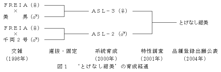 ナス栽培品種には、果実のへた、葉、茎に鋭いとげが発生し、栽培管理作業等を不快にし、作業性の低下を招いている。そこで、本県の消費嗜好に適した長卵形のとげなしナスを育成し、栽培の省力快適化を図る。 |
