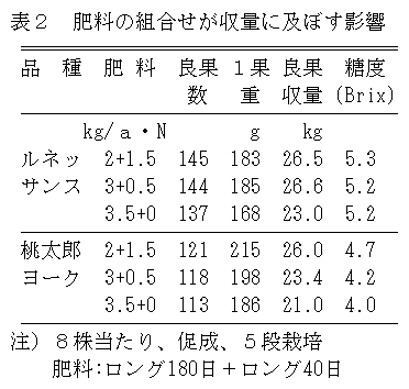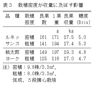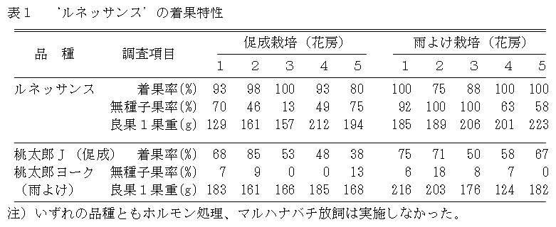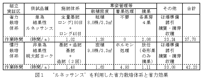 ‘ルネッサンス’は、省力で効率的な施肥法、摘果、6段摘心及び粗植を組み合わせた栽培体系により、作業時間を短縮し、果実品質の安定した栽培が可能となる。 |