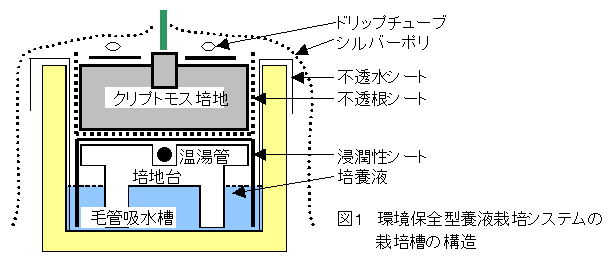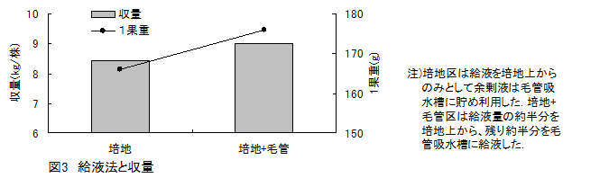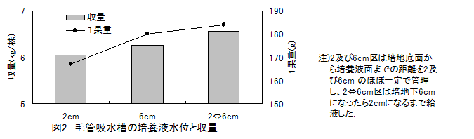 開発した環境保全型養液栽培システムでは、培養液は培地上および培地下に設けた毛管吸水槽(培養液貯留部)から浸潤性シートを介して供給される。そこで、本システムに適する給液管理技術を確立するため、毛管吸水槽の培養液水位、培地および毛管吸水槽への給液量の割合を明らかにする。 |